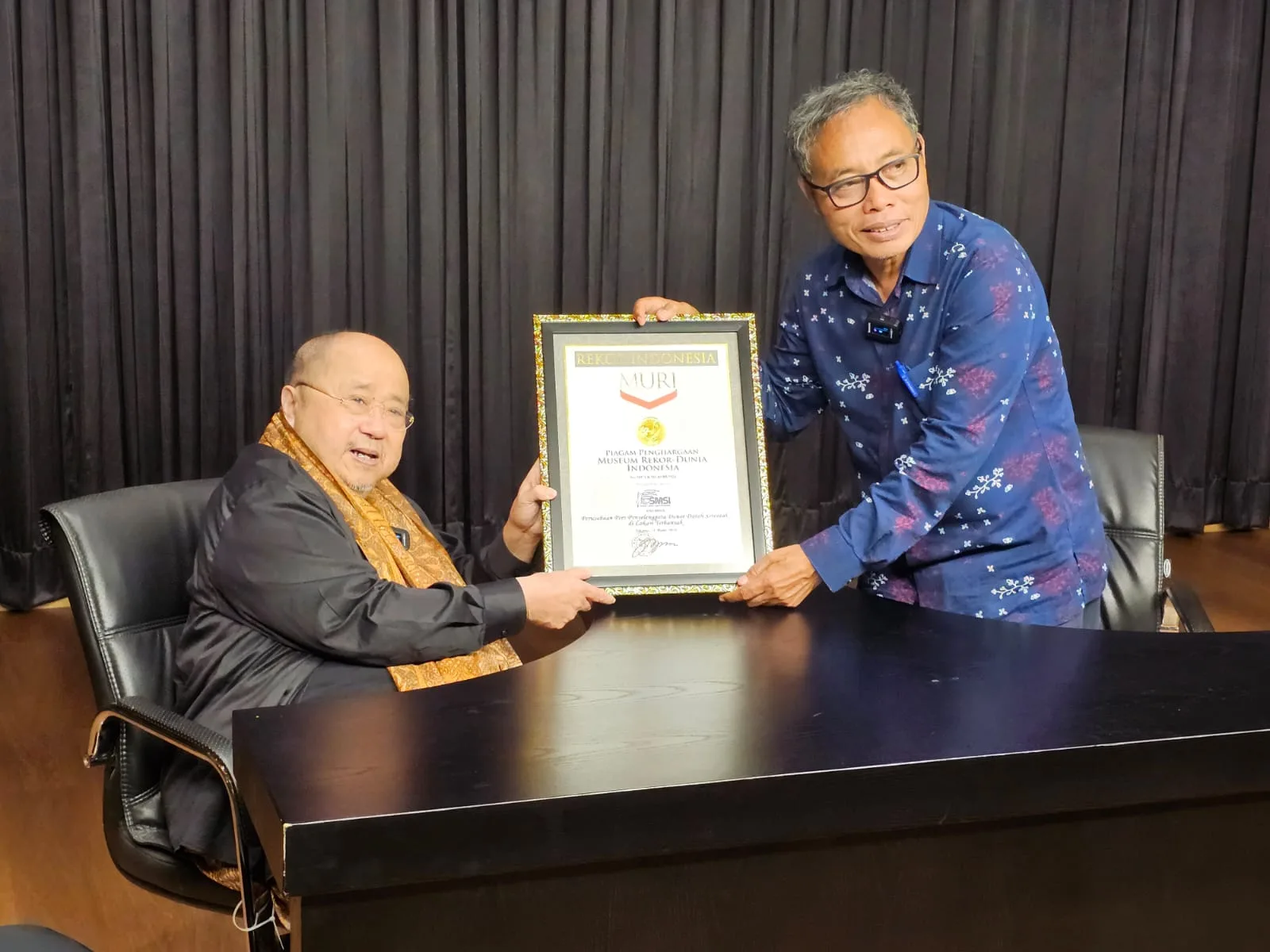 Setelah mendengar penjelasan Nasir, Jaya Suprana yang mengenakan selendang kain mengangkat piagam penghargaan MURI dan membaca ulang kata-kata yang tertulis dalam piagam, dan kemudian menyerahkannya kepada Nasir untuk SMSI.