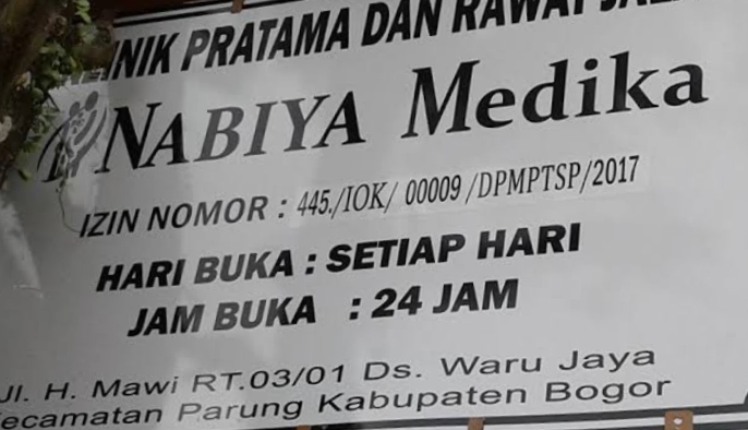 Klinik Nabiya Medika sendiri berlokasi di jl. H. Mawi, Warujaya, kecamatan Parung, kabupaten Bogor. Yang beroperasi 24 jam dan juga melayani pasien peserta BPJS kesehatan. Adapun pemilik dari klinik tersebut bernama Ramdani Fikri, S.Kep., Ners., M.Kep. Selain melayani fasilitas kesehatan, klinik tersebut juga melayani dibidang kecantikan.(Red)