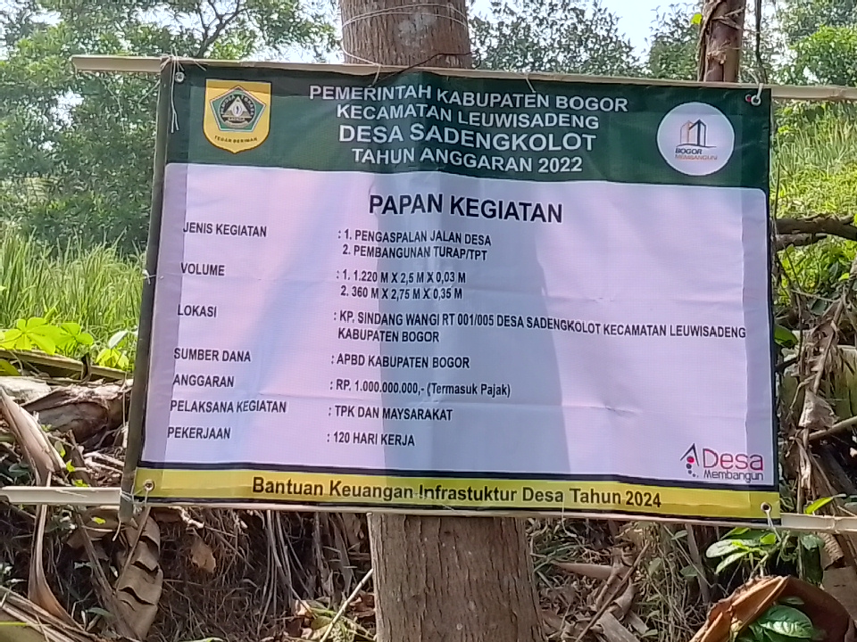 Kegiatan pengaspalan jalan desa dan pembangunan turap/TPT di Kampung Sindang Wangi RT 001 RW 005 mengantongi anggaran sebesar Rp 1.000.000.000 (Satu Miliar Rupiah) yang telah termasuk pajak.