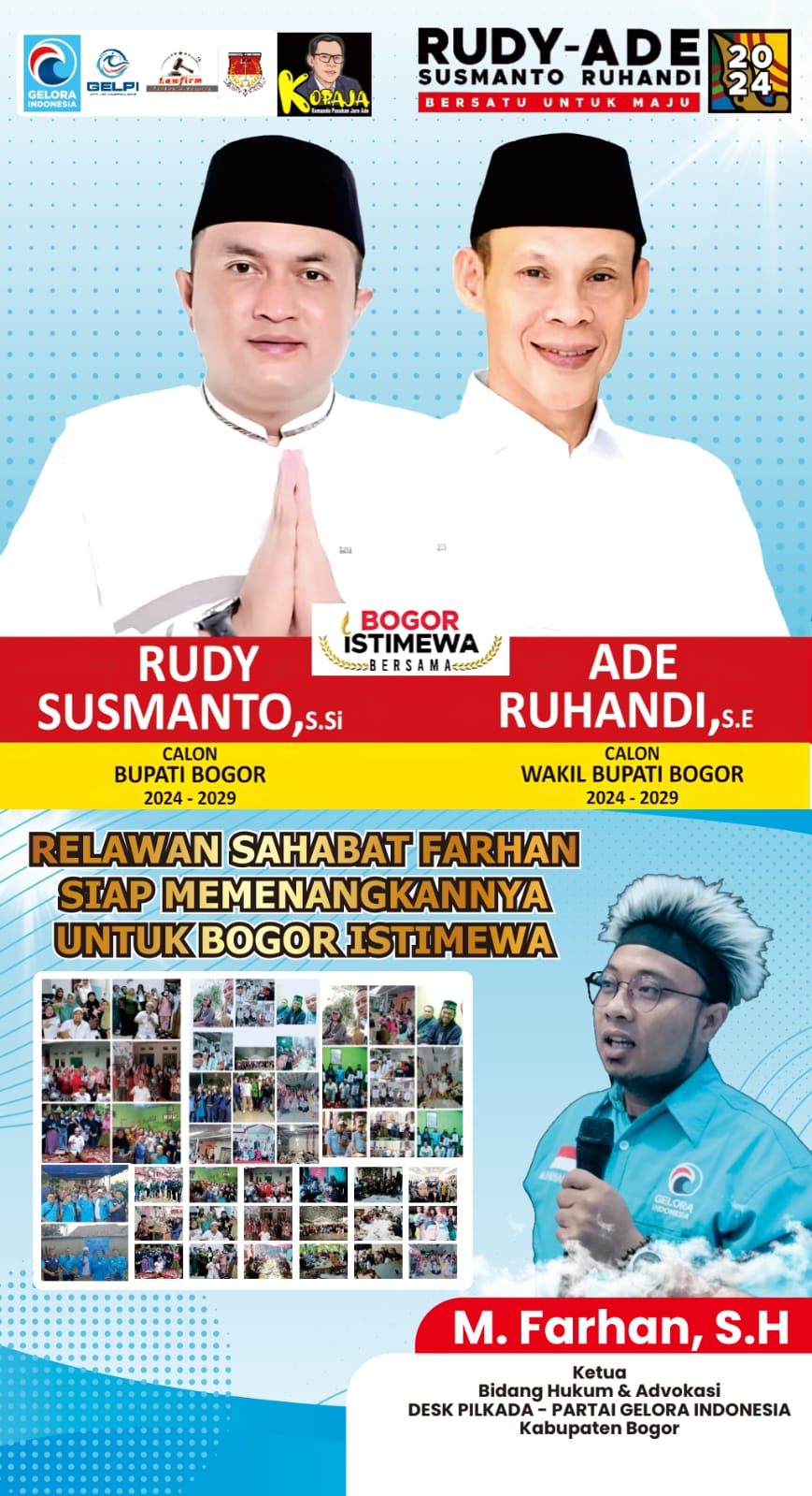 Sebagai bentuk nyata dukungannya, Farhan memasang baliho Rudi Susmanto dan Ade Ruhandi sebagai calon Bupati dan Wakil Bupati untuk periode 2024-2029 di berbagai titik strategis di Kabupaten Bogor agar terlihat oleh masyarakat.