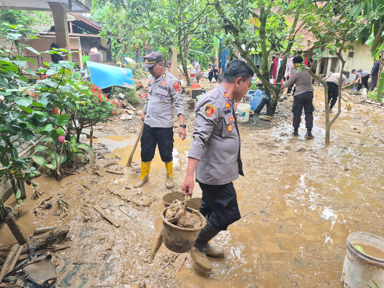BOGOR, BRN — Personel Polsek Cigudeg bergerak cepat membantu warga yang terdampak banjir akibat meluapnya Sungai Cisuda di Kampung Lebakwangi Pasar, Desa Rengasjajar, Kecamatan Cigudeg, Kabupaten Bogor, Minggu (19/4/2026).